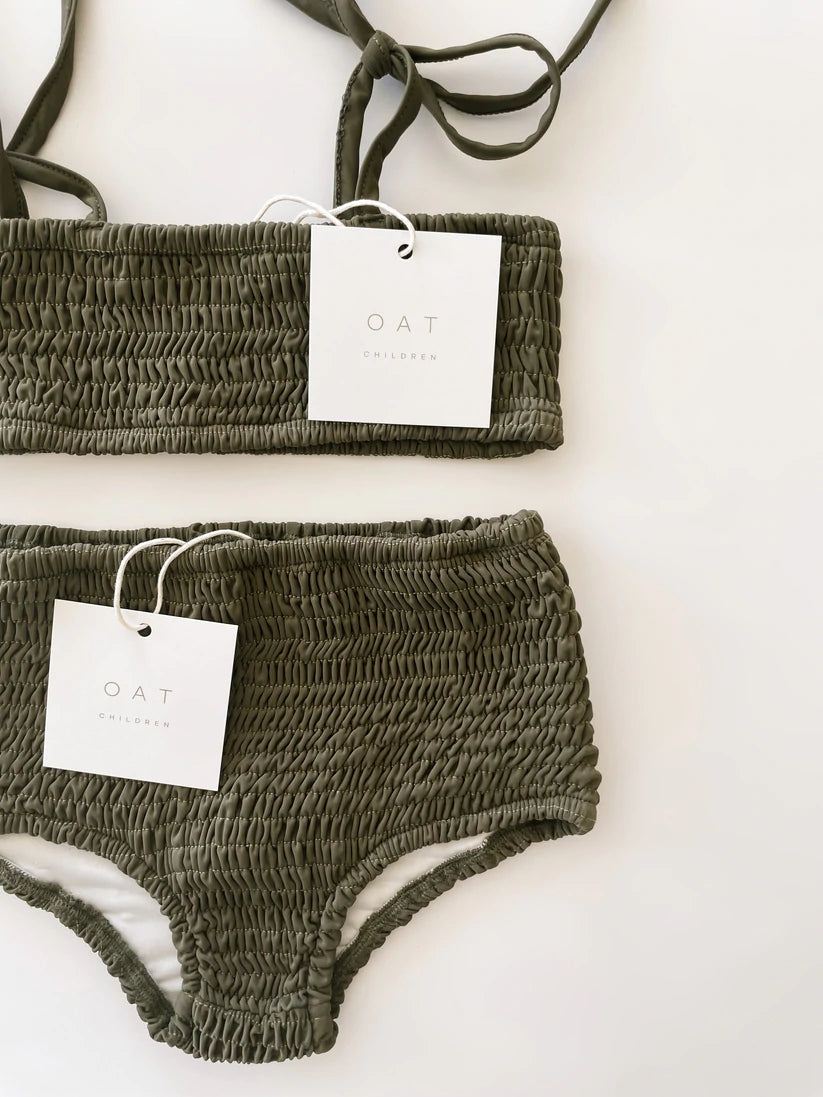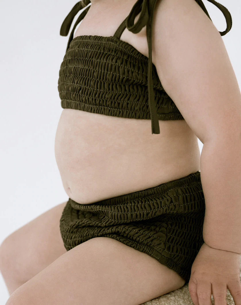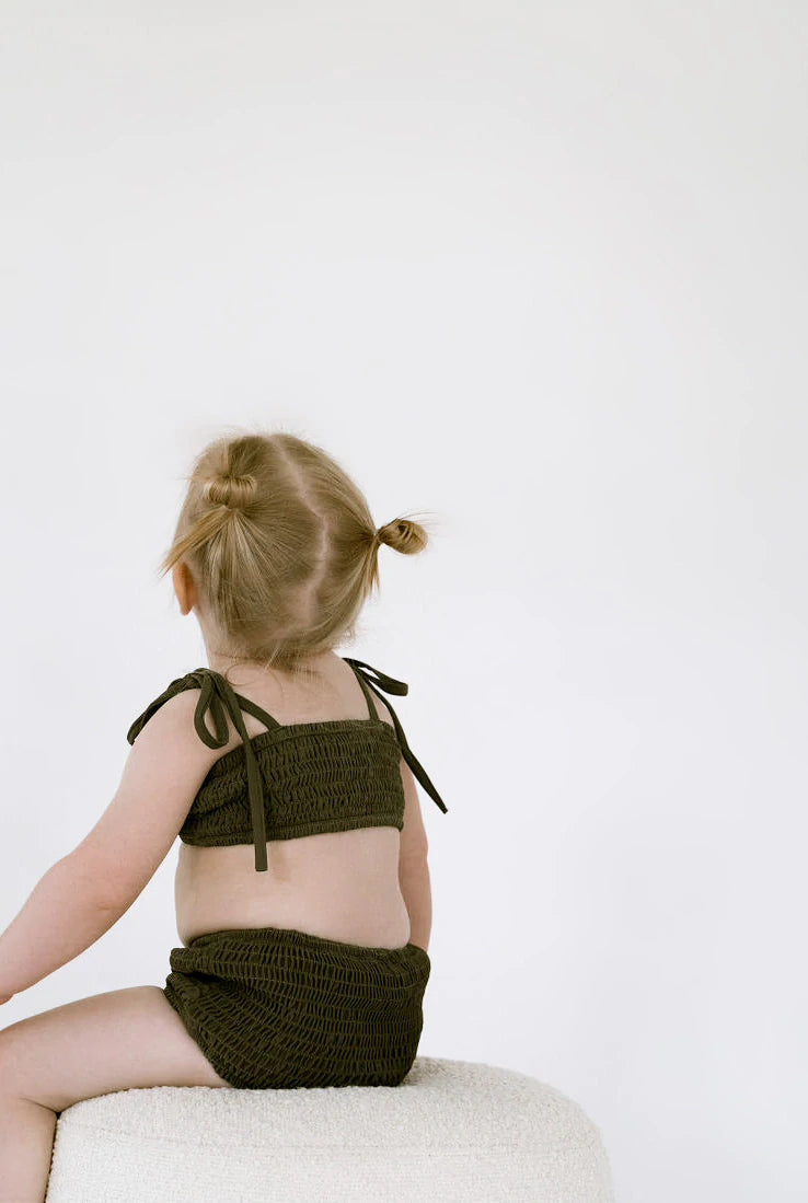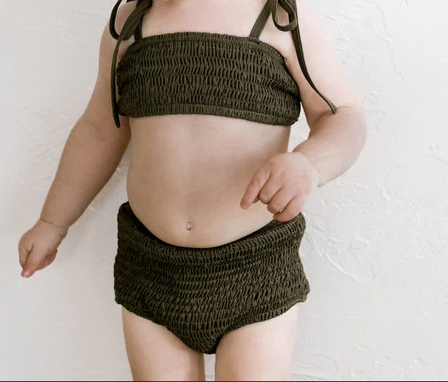 Summertime dreams! This smocked bikini top is the perfect swim piece for their summer wardrobe. It's an absolutely timeless capsule piece made for beach days and pool lounging. Made of soft material and fully lined for ultimate comfort and quality. The material gives both the tops and bottoms an amazing amount of stretch making them extremely versatile.