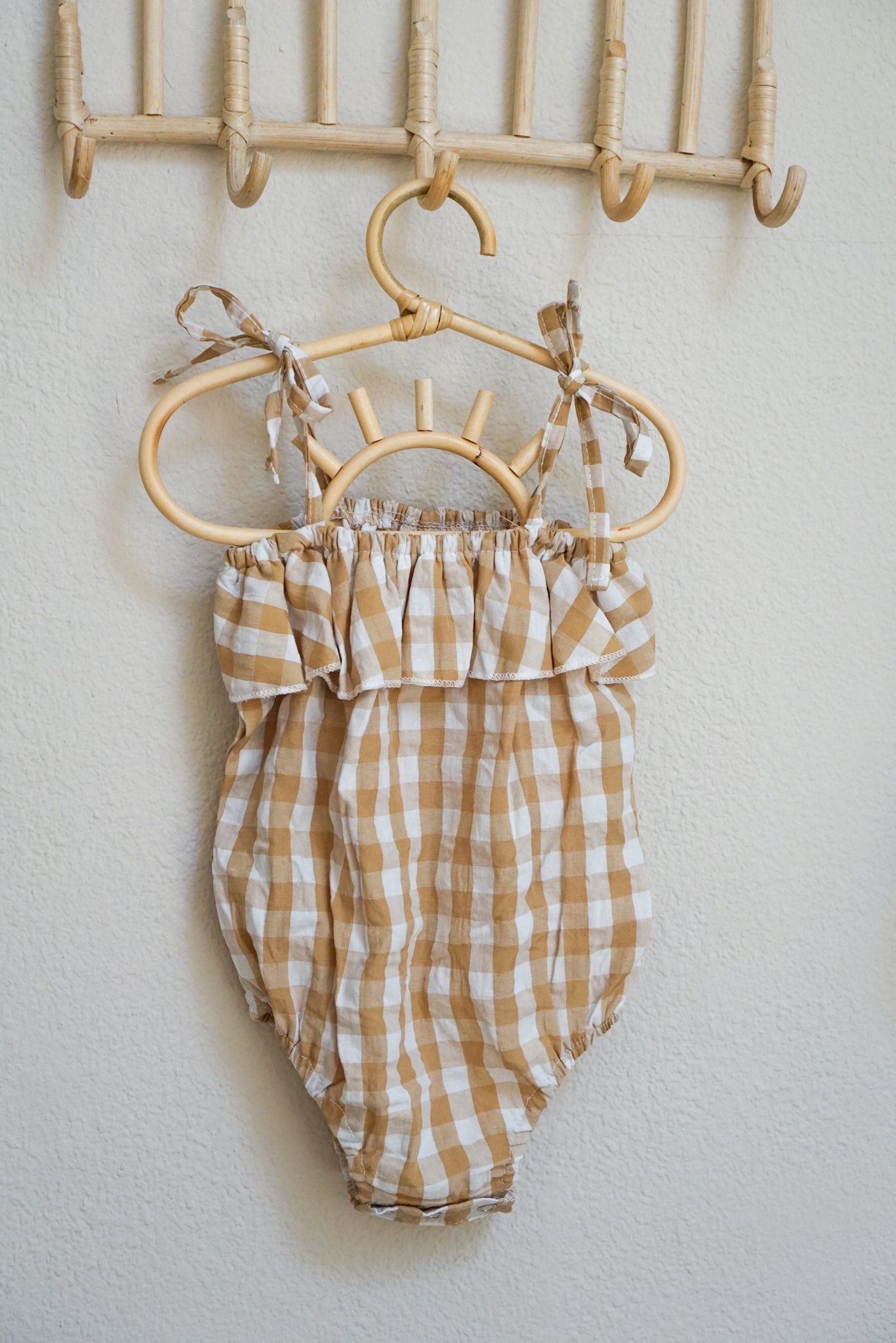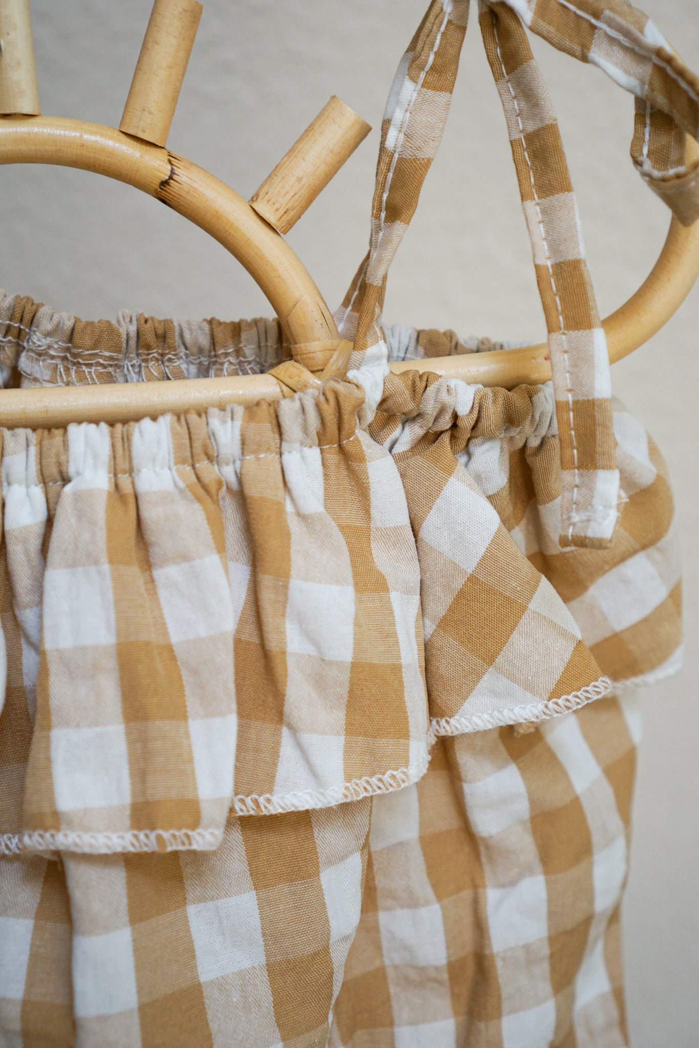 Our Mustard Plaid Romper was made for summer picnics and strolls through the garden. Complete the look with our matching head bow.