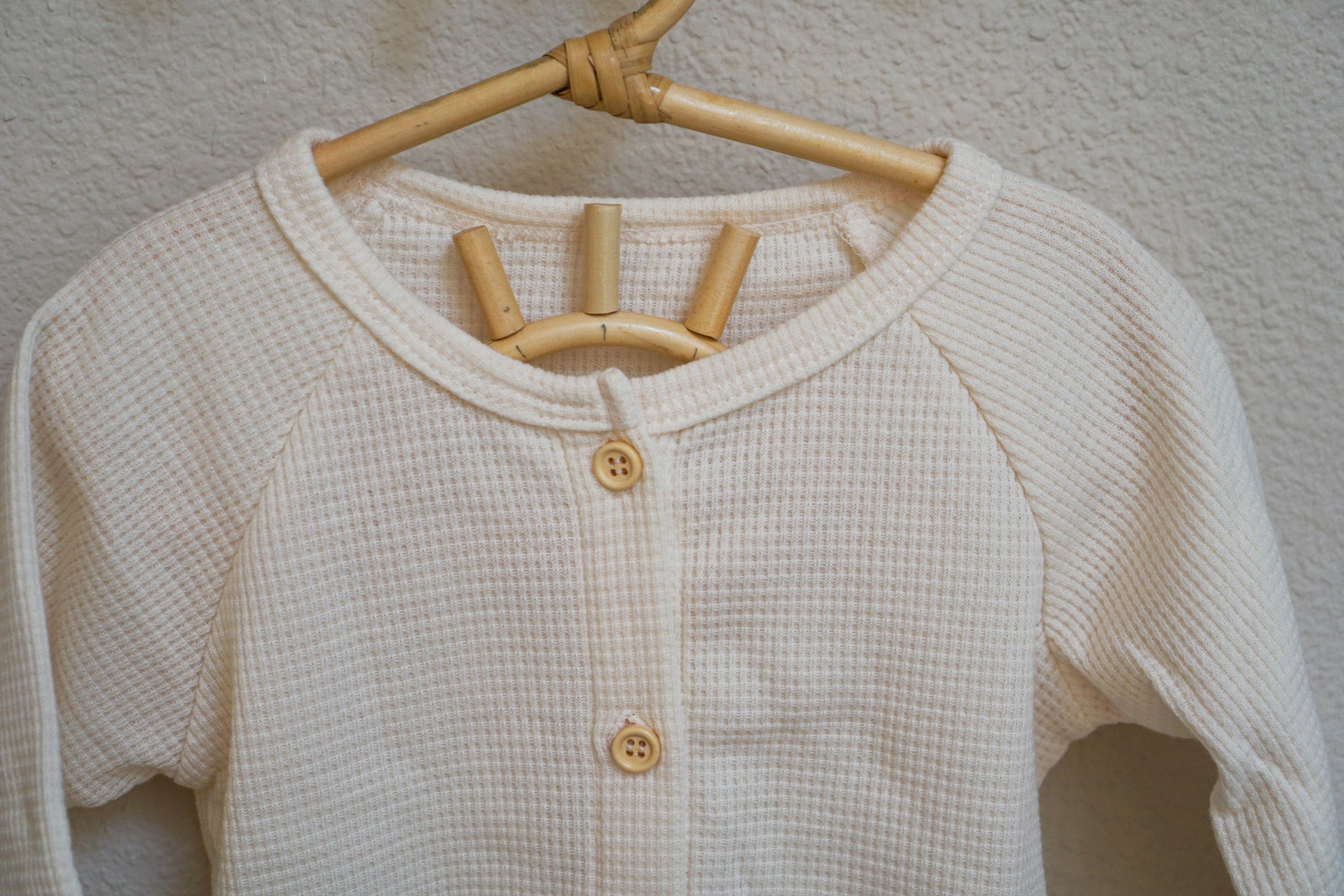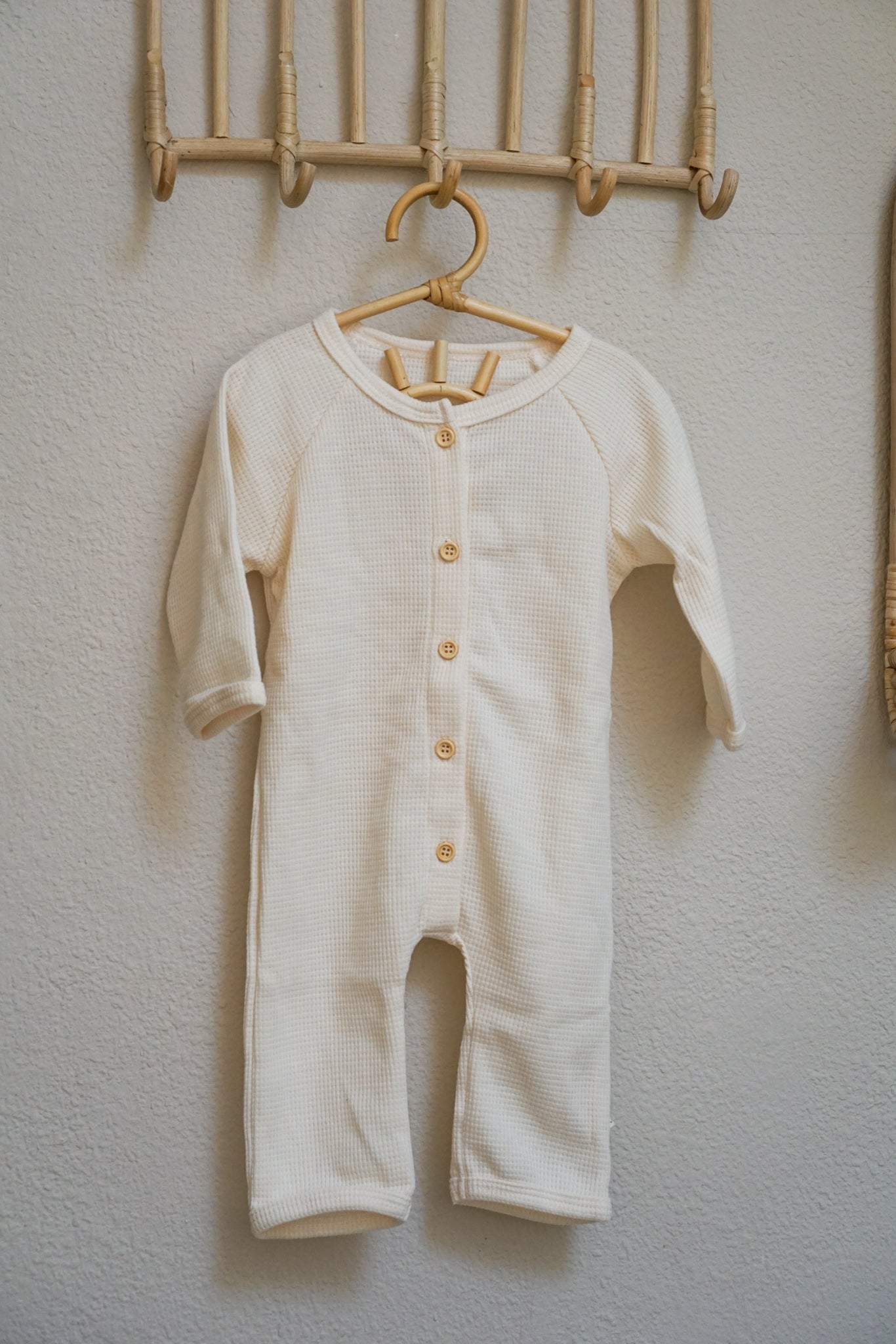 Our cream knit jumpsuit is the perfect neutral staple to add to your little's wardrobe! It is a lightweight knit that is perfect for summer temperatures.