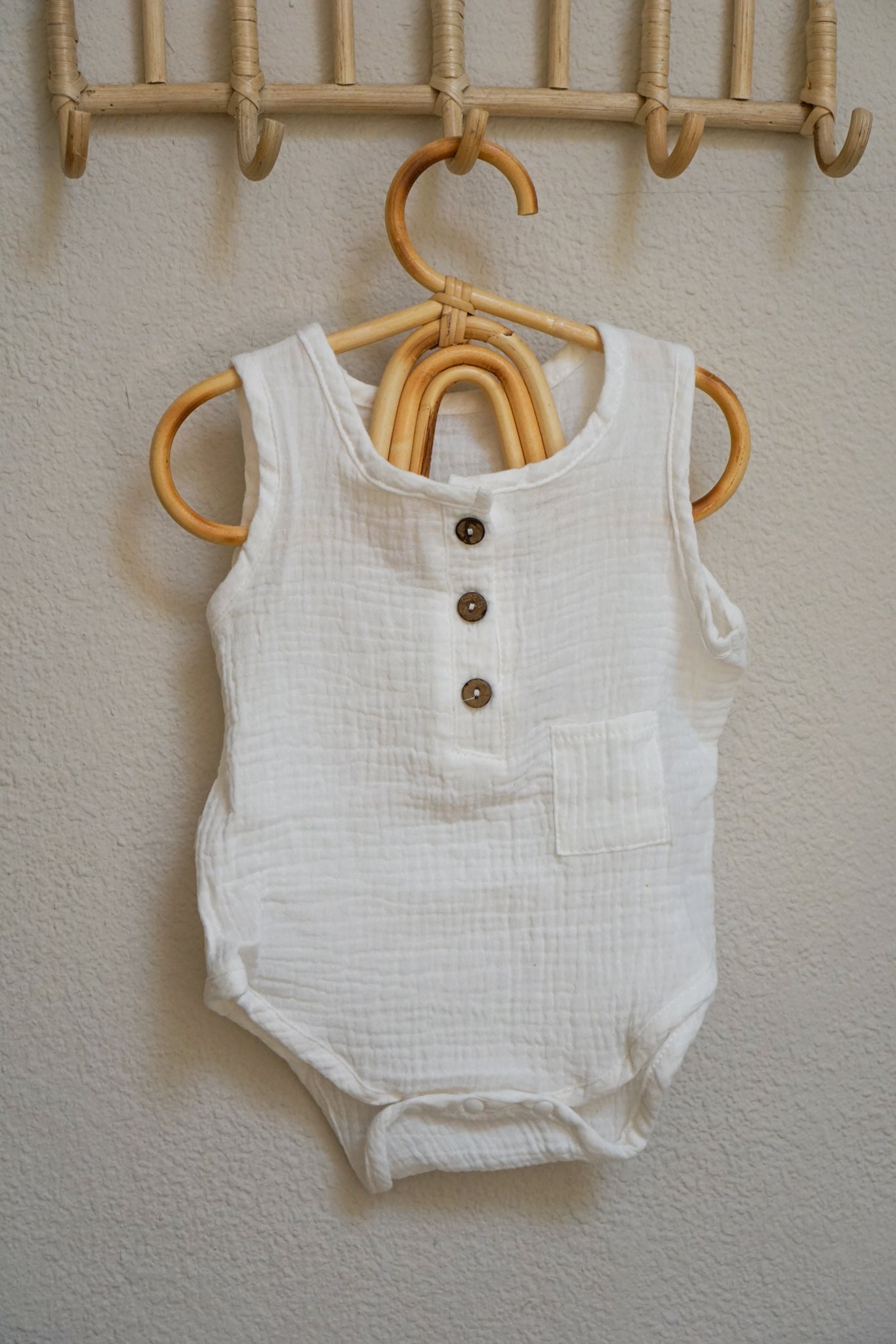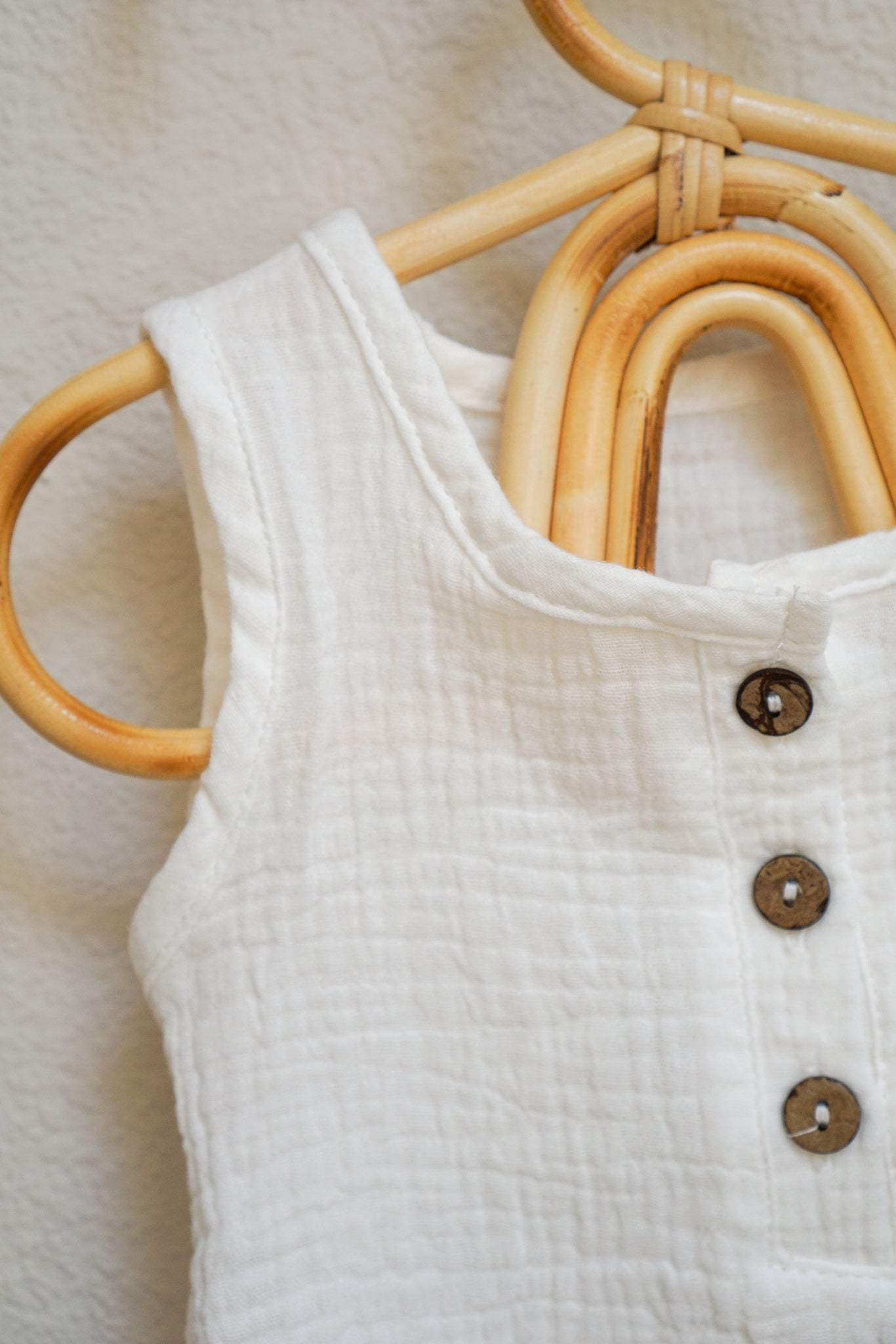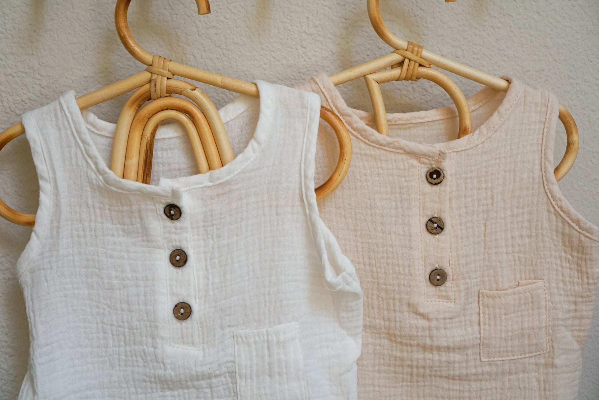 Our Cream Sleeveless Romper is the perfect basic for your little one to wear to make day to day tasks go by smoothly. Our button snaps make for easy diaper changes!
